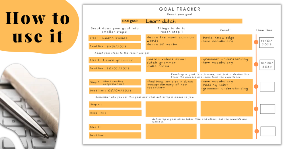 Reaching a goal requires a combination of planning, focus, motivation, persistence, and sometimes a bit of luck. Here is a goal tracker that helps you achieving your goals easily, step by step.
